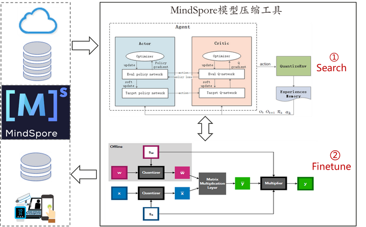 MindSpore训练后量化技术:训练后量化相较于量化重训具有两个明显优势,一是无需大量训练数据集,二是无需重新训练,离线快速转换。MindSpore采用pipeline组合量化方法,一阶段采用常规线性量化手段对权重和激活值进行量化,二阶段对量化误差进行分析,利用统计学方法对量化模型进行校正,补偿因量化带来的精度损失。