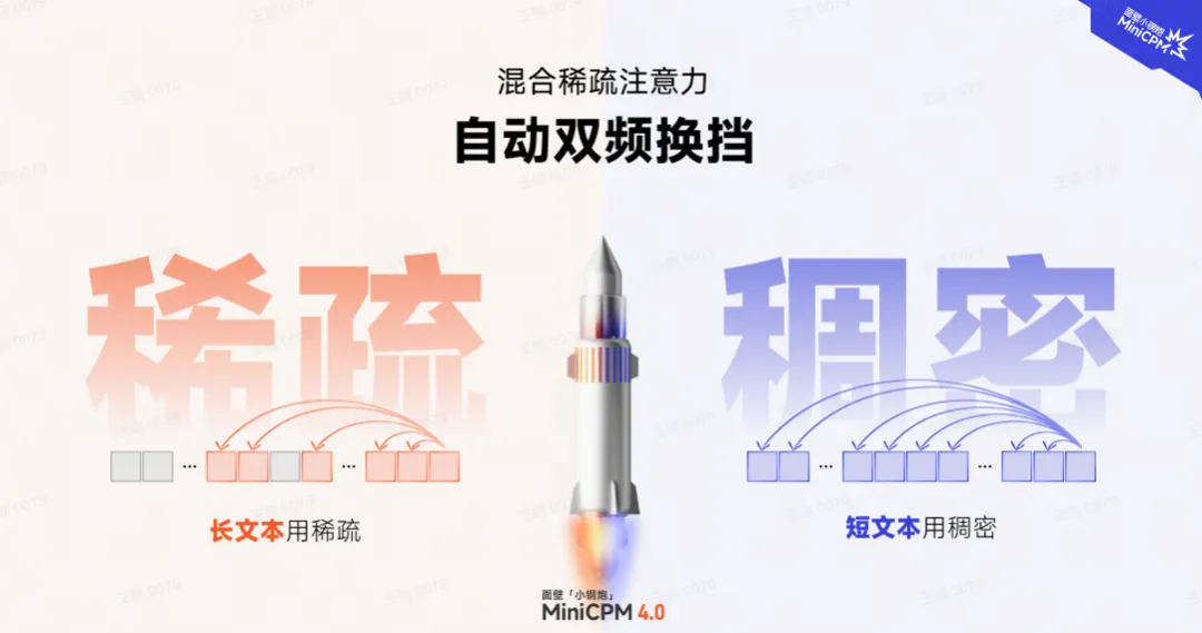 针对单一架构难以兼顾长、短文本不同场景的技术难题,MiniCPM 4.0-8B 采用**「高效双频换挡」机制**,能够根据任务特征自动切换注意力模式:在处理高难度的长文本、深度思考任务时,启用稀疏注意力以降低计算复杂度,在短文本场景下切换至稠密注意力以确保精度,实现了长、短文本切换的高效响应。
