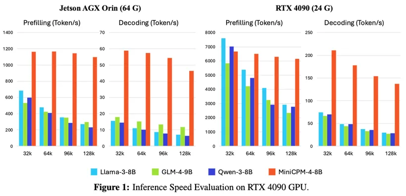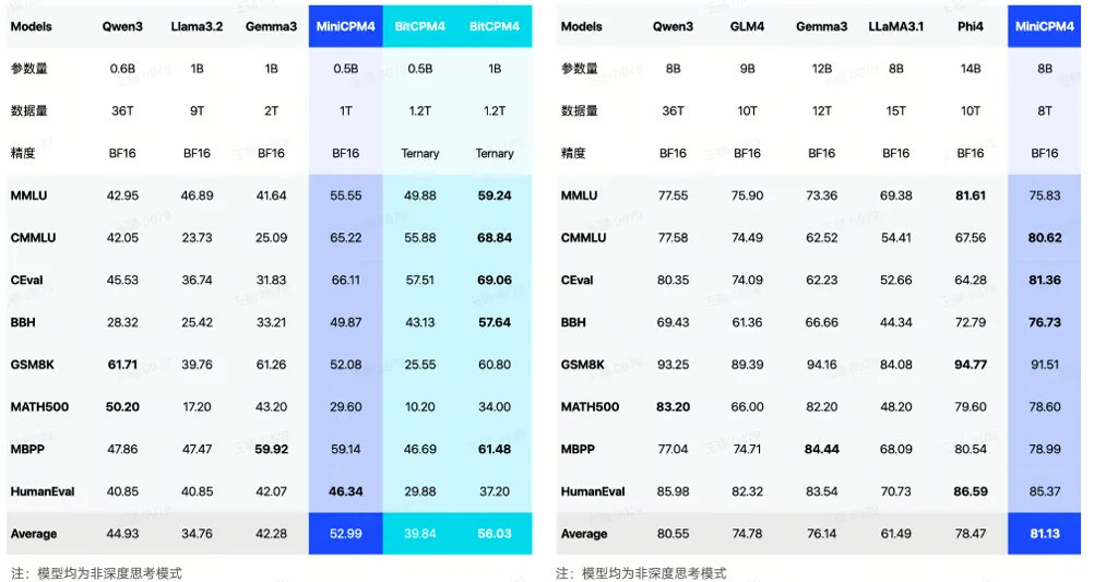 MiniCPM 4-8B 「闪电版」,为新一代稀疏高效架构模型,通过架构层、算法层、系统层、数据层等多维度的技术创新,MiniCPM 4.0 相较于 Qwen-3-8B、Llama-3-8B、GLM-4-9B等同等参数规模端侧模型,**实现了长文本推理速度 5 倍稳定加速以及最高 70 倍加速,并实现了同级最佳的模型性能,持续卫冕全球最强端侧模型。**继 Deepseek 之后,成为大模型领域又一次「标杆式创新」典范。