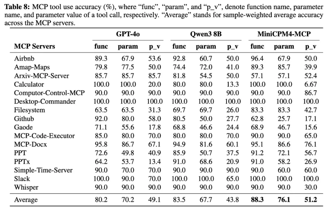 此外, MiniCPM 4.0可在 vLLm、SGLang、llama.cpp、LlamaFactory、XTuner等开源框架部署;同时加强了对 MCP的支持,且性能超过同尺寸开源模型( Qwen-3-8B),进一步拓展了模型开发、应用潜力。
