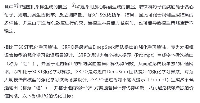 但SCST算法目前存在一定的局限性,其仅依赖单一贪心解码作为基线,可能导致优势估计方差高,并且仅参考贪心解码,生成多样性受限,而缺乏KL散度的约束也容易导致训练崩溃。