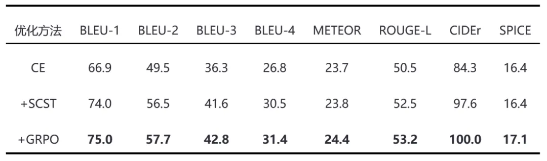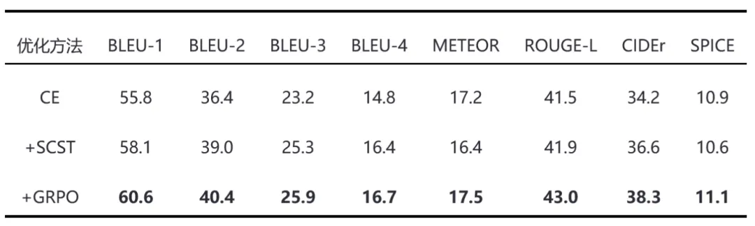 可以看到GRPO的核心思想是通过对输入提示生成多个候选答案,然后通过组内对比的方式,不断优化模型,并且通过约束策略更新的幅度与KL散度,极大的保证了模型在训练过程中的稳定性。因此GRPO算法非常适用于图像描述领域。GRPO通过组内对比,即使整体奖励稀疏,模型仍能通过组内差异学习优化方向。例如,在生成错误描述较多的组中,相对优势可有效区分部分正确与完全错误的输出,最大限度的保证模型朝着正确的方向优化。此外相比于SCST仅采样一个答案,GRPO采样多组答案,组内多候选生成覆盖更广的解空间,结合KL散度约束,GRPO能在保证流畅性的同时提升多样性。