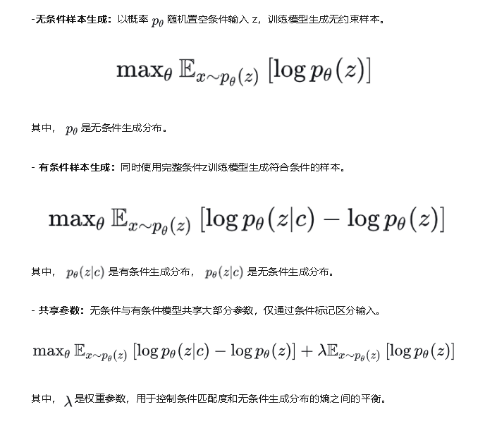 2、**联合训练策略:**通过随机丢弃条件信息,使同一网络同时学习无条件与有条件生成;