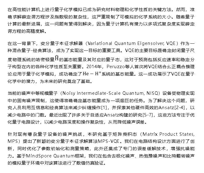 本工作提出了一种创新的变分量子特征值求解器,在电路初始化、电路结构设计,以及针对计算误差和测量误差的纠错策略三个方面进行了改进,能够有效缓解NISQ设备中不可避免的噪声问题。在项目中使用了通用量子计算框架MindSpore Quantum进行了数值仿真验证,该框架支持多种量子神经网络的训练和推理,同时,昇思社区提供了丰富的技术资源、详尽的文档介绍,使开发者能够快速上手使用该框架开展实验。