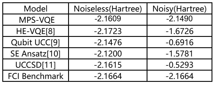 表2 基于MindSpore框架,在理想环境和噪声模拟环境下,不同VQE模型对H4分子基态能量的性能对比