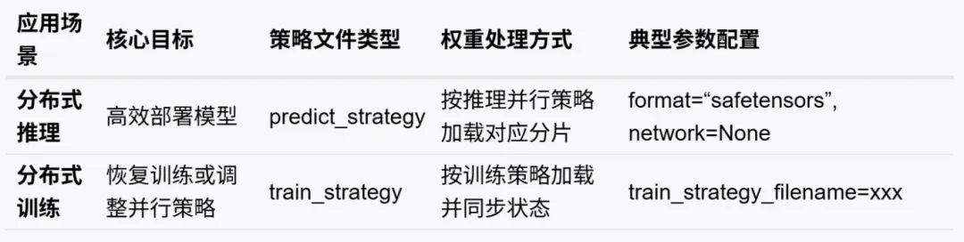 - **策略文件:**训练使用train_strategy(含优化器状态、训练超参),推理使用predict_strategy(侧重模型结构与并行部署)