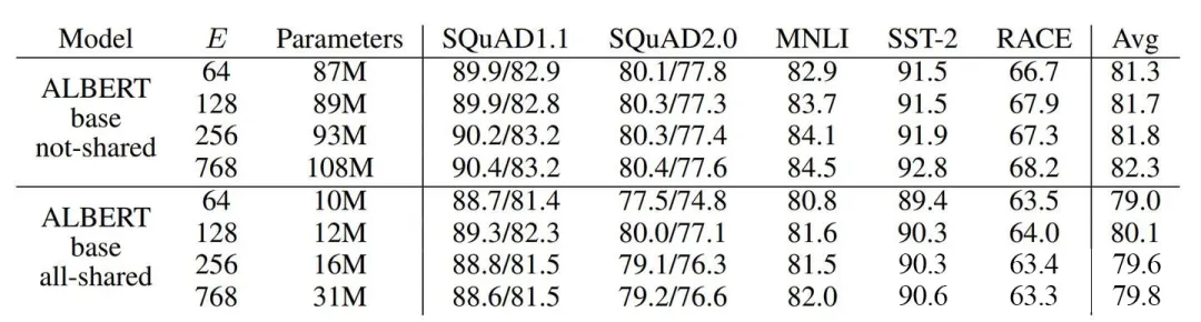Table 2: The effect of vocabulary embedding size on the performance of ALBERT-base.
