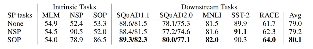 使用SOP在下游任务中展现出比NSP更高的性能。