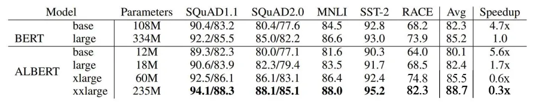 bert和albert-xxlarge在上图中五个数据集上的得分均高于bert-large,而前者参数量仅为后者的70%左右。