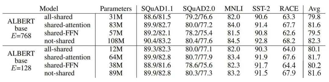 共享参数有多种可选择的策略,例如,仅在各层之间共享前馈网络(FFN)参数,或者仅共享注意力参数。ALBERT 的策略是在各层之间共享所有参数。