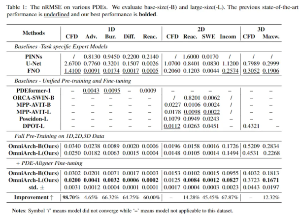 表:OmniArch在11类PDE上的nRMSE性能对比(越低越好),显著优于专用模型(上)与其他统一预训练模型(中)。下划线为之前SOTA,加粗为本文最佳。