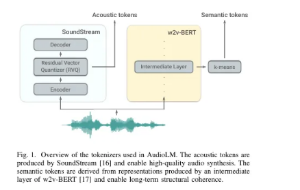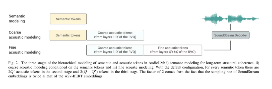 从原始音频波形开始,本论文首先从一个使用自监督掩蔽语言建模目标预训练的模型中构建粗略语义标记。这些标记的自回归建模捕捉了局部依赖关系(例如,语音中的音素、钢琴音乐中的局部旋律)和全局长期结构(例如,语音中的语言语法和语义内容;钢琴音乐中的和声和节奏)。然而,这些标记导致重建质量较差。为了克服这一限制,除了语义标记外,我们还依赖由SoundStream神经编解码器产生的细粒度声学标记,这些标记捕捉了音频波形的细节,允许高质量合成。训练一个语言模型来生成语义和声学标记,同时实现高质量音频和长期一致性。