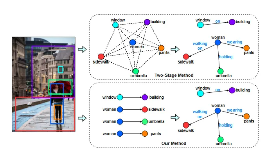 当前主流的场景图生成方法基于两阶段流程。模型首先使用检测器生成实体候选框,再通过神经网络对物体候选框之间的关系进行分类。这种方式能够实现良好的效果,但面临着模型参数量大、计算复杂度高等(O(n^2))问题。