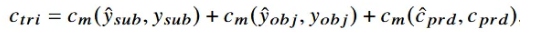 RelTR扩展了DETR的损失计算方式,设计了专门用于三元组检测的集合预测损失。该损失函数通过计算三元组预测(包含主/客体置信度、谓词置信度及边界框IoU)的cost矩阵,将真实三元组分配给最匹配的预测。未被匹配的预测会被赋予<背景-无关系-背景>标签。