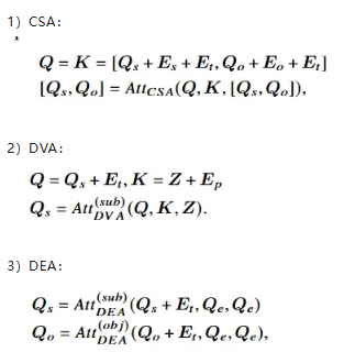 RelTR 设计了 耦合自注意力机制(CSA)、解耦视觉注意力(DVA)和 解耦实体注意力(DEA)。三种注意力计算方式分别如下: