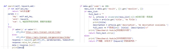 为了优化流程,方便用户自主搜索感兴趣的新闻,我们通过以下代码实现了根据用户输入的文字自动检索相关新闻,并支持AI相关新闻的重点搜索。例如,用户输入关键词“华为”后,可以进一步选择是否聚焦与“华为+AI”相关的新闻(建议使用天行数据API进行检索)。