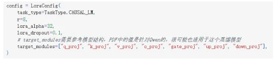 - lora_dropout=0.1:表示在LoRA模块中以10%的概率随机“关闭”某些神经元连接,以减少过拟合的风险。