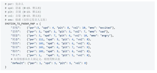 我们使用了语音合成技术(Text-to-Speech, TTS)将书面文本转换成人类可以听懂的口头语言。通过调用API,根据情感设置不同的语速、语调等。如下是不同情感的参数参考,我们通过预先定义不同情感所对应的声学参数组合(如语速、语调、音量、发音人等),在调用API时动态传入这些参数,从而生成富含情感。