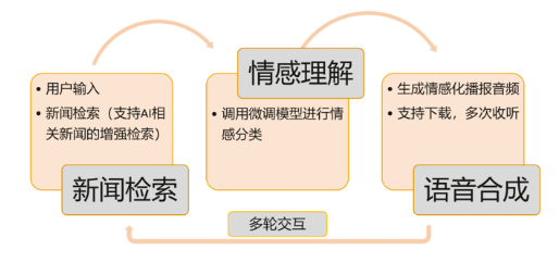 本项目通过新闻检索-情感分类-语音播报的端到端流程实现带有感情语调的新闻播报,提升新闻的感染力,同时应用场景也可扩展至新媒体与有声读物、智能座舱与车载助手、教育与陪伴机器人、舆情监控与品牌管理等多种领域。