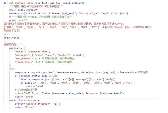 下图为数据标注的代码实现,如果开发者准备了其他领域的数据集,也可参考下方逻辑,自行设计prompt和模型解码的超参。因为我们的目标是生成简短的情感分类标签,所以我们的想法是将max_tokens设置成了5,限制输出长度,使模型只输出分类结果,减少意外输出;并将temperature设置成0,让输出更确定。