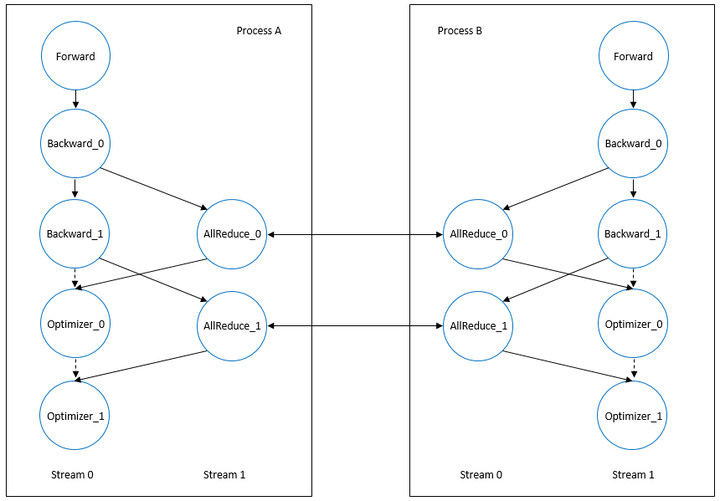 上面展示的是两个训练进程之间计算、通信如何做到基本的并行,这里描述的是使用双流的场景,其中正向算子,反向算子以及优化器使用了stream 0, 集合通信算子使用stream 1。从图上可以容易看出Backward_1和AllReduce_0可以实现并行执行,而Optimizer_0和AllReduce_1同样可以实现并行执行。然而这样仅仅是理论上的理想状况,实际训练时的场景要复杂一些,例如需要按照什么样的大小来对多个Backward和AllReduce算子进行切分,这里又涉及到物理上使用的计算设备的性能以及网络带宽的大小;Backwark_1和AllReduce_0的执行时间能够完全重叠的前提是Backward_1在GPU上的算子执行时间和AllReduce_0的通信时间要大致相当;以及stream 0和stream 1之间同步的开销,多个AllReduce算子能否再拆分到多个stream进行并行加速等。