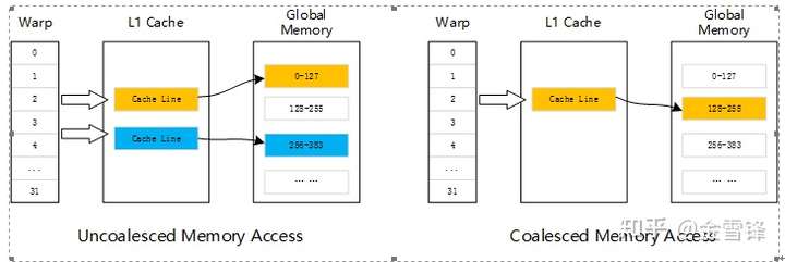 除了计算上的优化,计算过程中对于设备存储的高效使用也是性能优化的重要因素,GPU上的存储类型有HBM、Shared Memory、各级Cache以及Register,而不同存储类型的访存带宽存在很大的差异,例如在Tesla V100上HBM2, L2 Cache, Register的带宽分别为900G/Sec, 2155G/Sec和>20000GB/Sec。在Kernel中合理利用这些快慢存储,有助于提升算子的性能,例如对于Shared Memory,在性能上和L1 Cache接近,在提供更高的带宽和更低的延迟的同时,还可以提供显式编程接口,为开发者提供灵活的使用方式。而在Kernel访问Global Memory时,数据会经由L1/L2 Cache进行缓存,通常是以128字节或者32字节内存事务来实现,具体是由GPU架构、访问类型和编译选项共同决定的。以L1 Cache为例,一行L1 Cache是128字节,它映射到Global Memory中一段128字节对齐的地址空间。如果Warp中的每个线程访问4字节的数据,Warp中的首个线程访问的地址是128字节对齐的,并且全部32个相邻线程访问的连续的地址时,Warp可以通过一次内存事务读取128字节的数据。