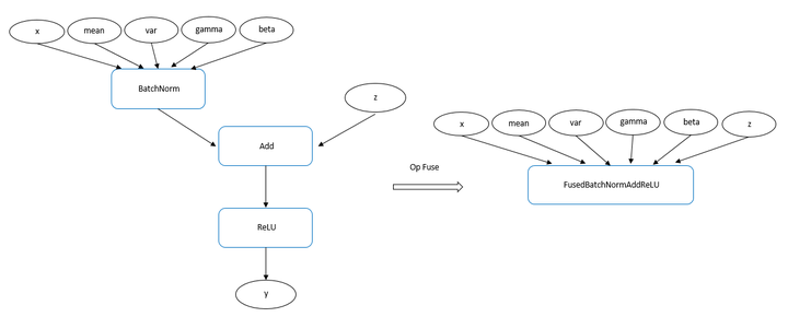 其中参数xData,yData分别表示BN算子的输入和Relu算子输出,而zData是cuDNN为Residual Unit结构中的Add算子单独提供的实现,目的是将BN、Add算子融合起来,activationDesc可以将激活函数也和BN融合起来,最后完成了BN、Add、Relu三个算子的融合,而在MindSpore中对应的Kernel实现为FusedBatchNormReLU算子,这样就避免了BatchNorm和Add计算的中间结果保存和加载操作。