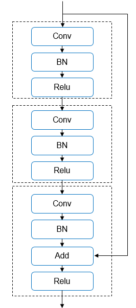 上面讲了自动混合精度训练以及TensorCore的硬件加持,另外一个很重要的性能优化手段是计算图优化以及算子融合。例如在Bert的网络结构中存在大量的小算子,一方面增加了框架和设备的调度开销,另一方面也增加了内存以及内存拷贝的开销,通过算子之间的计算融合,一方面使得计算中间数据直接在SM内的Register中完成计算,减少对Global Memory的读写次数,大幅提升算子性能;另外一方面也可以减少运行时的调度开销,并给nvcc编译器执行低层次优化提供了空间。在MindSpore中从两种方式探索解决图优化和算子融合的问题,一个是自动优化方式,在MindSpore中叫做图算融合+AKG (Auto Kernel Generator),可以根据指定Pattern自动完成图算融合,有关AKG的技术细节可以参考:https://github.com/mindspore-ai/akg。另外一种方式是手工融合优化,下面我们以ResNet50为例,介绍几种手工融合的常见场景,在ResNet50中存在一种残差结构,称为Residual Unit,其中一种结构如下图所示: