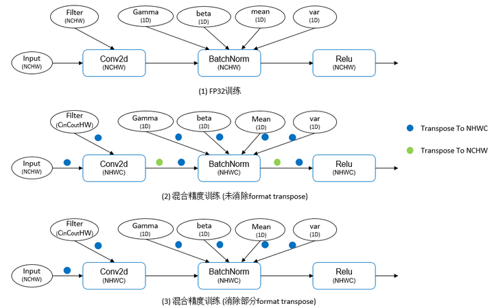 不同的算子采用不同的精度以及不同的format会带来转换的开销,如果不进行优化,这部分转换的开销会抵消掉TensorCore带来的硬件加速收益。训练中网络的Tensor转换来自两个部分,一个是相邻算子间的精度和format差异,上游算子的计算输出Tensor需要和下游算子输入Tensor保持同样的精度和format,如果不一致,需要执行精度Cast以及format的Transpose;另一个是模型权重的Cast以及Transpose,原因是模型的权重是框架预先在GPU显存中分配并写入,而写入的精度为FP32,format为NCHW,因此算子在读取权重参与计算时,需要按照算子预期的精度和format进行相应转换,另外一些框架采用双权重的方法避免了权重的运行时转换。