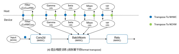 为了进一步消除单Step训练中的转置开销,可以想到将模型权重在GPU显存上直接按照NHWC的format进行保存,而仅在需要将权重在Host和GPU显存之间进行拷入拷出时才进行format转换,既权重在Host侧内存中采用NCHW格式保存,初始训练时拷贝到GPU显存时转换为NHWC格式,在模型训练结束后并拷贝到Host内存时,再恢复为NCHW格式,因此在训练过程中就避免了模型的权重转置开销。