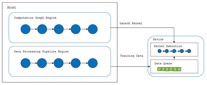 如上所示为MindSpore的数据与计算部分如何配合工作的示意图,为了解决数据处理自身的性能问题,在数据处理的各关键环节中都尽量的采用了多线程来并行处理任务;而在数据处理与计算进行交互上,采用了在设备侧的显存上开辟一个存放已处理好的训练数据的数据队列,数据处理模块与计算模型分别各自异步的向队列中写入以及读取数据,只有满足数据写入的速度不低于训练计算的速度,系统整体训练性能才有能达到最优的可能性。
