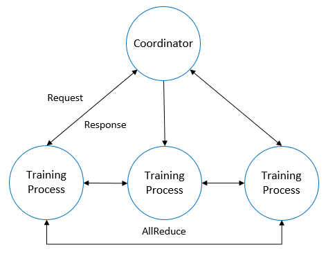虽然CUDA为算子间并行提供了Multi Stream机制,具体神经网络训练中的并行控制逻辑在不同系统上仍有不同的算法以及工程实现方式, 以Horovod为例,Horovod以Tensor Fusion为核心概念来解决计算和通信的并行问题。如下图所示,在训练过程中,其中一个训练进程充当了协调者的角色,其余训练进程则通过协调者达成何时真正开始启动执行AllReduce操作,而在正式启动AllReduce通信的时候,通信的参与方实际进行交换的是内部通过Buffer缓存的一组梯度数据,这组梯度数据通过一次或多次通信完成了AllReduce计算过程,而这一通信过程和部分反向算子可以并行执行,从而将通信的时间隐藏在了计算时间内,缩短了端到端的训练时间。