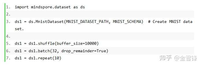 如下示例中,读取MNIST数据集时,对数据进行shuffle、batch、repeat操作,具体先对数据进行混洗,再将每32条数据组成一个batch,最后将数据集重复10次。有关MindSpore数据处理更详细的设计思路可以参考另外一篇文章:AI框架中数据处理的挑战与解决思路。