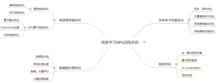基于GPU硬件的深度学习训练性能优化是一个端到端的系统问题,涉及到编译,执行调度,计算,通信,数据,分布式,算法等非常多的技术领域,可以从不同的角度进行切入。例如从GPU训练加速的角度考虑,可以分为GPU单卡性能优化,以及多卡上如何提升加速比;从数据和计算的角度考虑,可以分为数据预处理的优化,以及网络中算子的计算优化;另外从内存优化的角度出发,需要考虑如何降低内存以及显存的占用量,以及在运行中内存使用和管理的性能。上述每一项又会涉及到较多的技术细节问题。