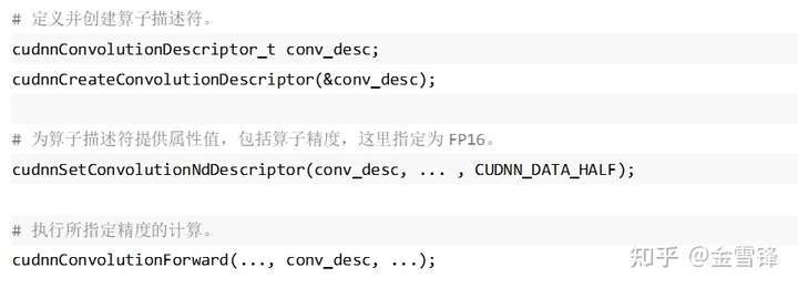 Nvidia提供了两种使用TensorCore的方式,一种是通过cuDNN、cuBLAS提供的API,例如Conv算子,可以直接指定算子精度,这种方式是主流框架包括MindSpore所使用的方式。cuDNN对所提供算子的输入Tensor和Filter数据定义了枚举类型cudnnDataType_t,具体指包含:CUDNN_DATA_FLOAT、CUDNN_DATA_HALF、CUDNN_DATA_INT8、CUDNN_DATA_INT32等类型,分别对应FP32、FP16、INT8、INT32。仍以卷积,在使用cuDNN时通过如下步骤可以完成Conv的FP16计算: