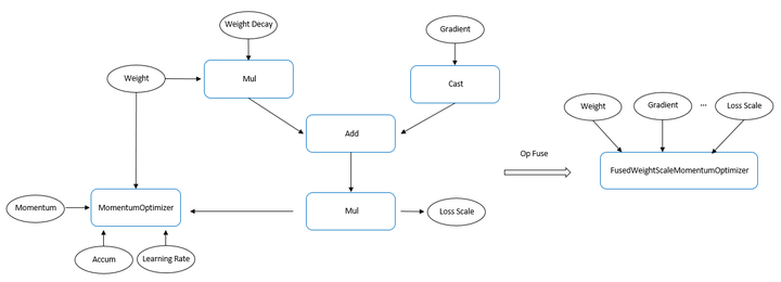 上述例子属于典型的相邻算子融合,此外还有一种非相邻算子的融合,典型的有多优化器的融合。例如在ResNet50网络中有上百个优化器算子,这些优化器算子之间并没有直接的数据或执行的依赖关系,只要输入的梯度被相应的反向算子计算出来,该优化器算子既可执行,因此可以将多个优化器算子进行融合,进一步降低执行链路上的开销。