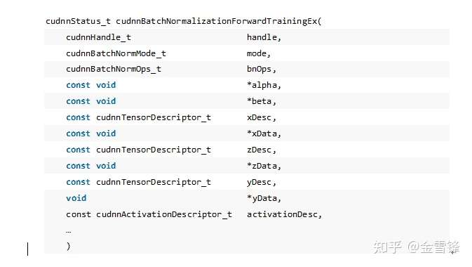 这个Residual Unit在网络中重复出现,其中Conv, BN和Relu算子在cuDNN中都有高性能的实现,进一步查看cuDNN的API手册,可以发现cuDNN中BN算子cudnnBatchNormalizationForwardTrainingEx已经为这种残差结构做了特殊的优化,算子API如下所示(部分参数省略):