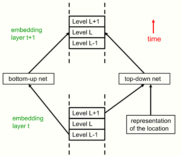 - 时间t-1时层级L-1的embedding通过bottom-up网络的预测。