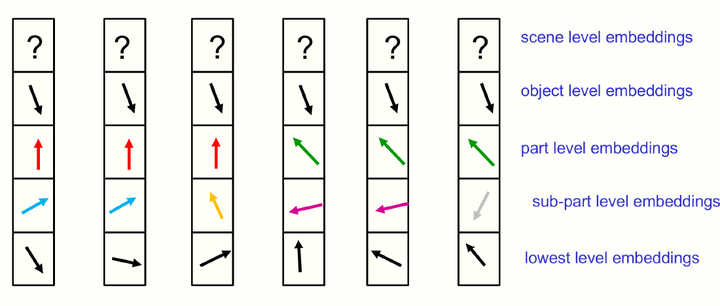 对于一张静态的图片,如图2所示,某一层级的相近的embedding向量形成“孤岛”,各个层级的“孤岛”形成一颗“解析树”,这些“孤岛”在更高的层级上会变得更大。Hinton认为这些特征孤岛相比于短语结构语法要强大得多,它们可以轻易地表示不相连的物体。