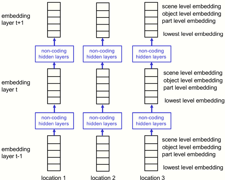 GLOM是由大量的column组成,每个column是局部空间的自编码器用以学习不同层级(level)的小块图像表示。单个column分为多个层级,每个层级对应于局部-整体层次结构。在不同层级之间网络的参数可以不同,但在不同的column和时间t下参数是共享的。如图1所示,不同层级之间包含了bottom-up编码器(蓝线)和top-down解码器(红线)。按照Hinton的想法,每一个离散时间t,每一个column中层级L的embedding更新来自四部分: