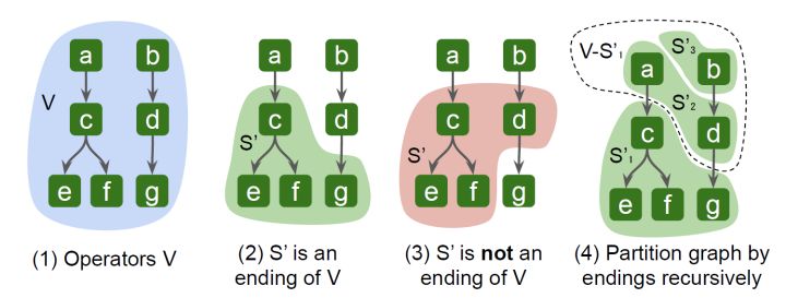 给定计算图G的顶点集合V,V的一个子集 S会将顶点集分为V – S和S,如果V – S和S之间的所有边E’都是从子集V – S指向子集S, S即称为V的一个尾段(Ending)。如图3-2所示,S’是顶点V的一个尾段,而图3-3中S’就不是一个尾段,3-4表示了将整个计算图按照尾段递归划分的方法进行了段划分。