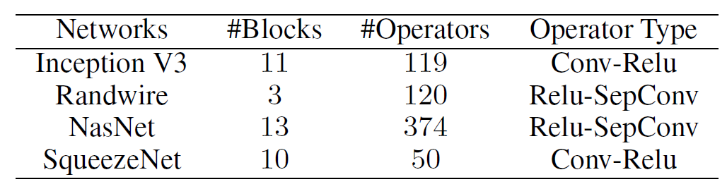 IOS属于框架不敏感算法,作者基于python实现了IOS调度算法,并使用C++实现了执行引擎。该执行引擎是基于商业库cuDNN,也支持算子间的并行。为了支持多组算子并发执行,IOS将不同组的算子分配到不同的CUDA流,当有充足的执行资源时,不同的CUDA流会并发执行。实验中采用了cuDNN 7.6.5, CUDA 10.2, NVIDIA driver 450.51.05, 并与 TensorRT 7.0.0.11 和 TVM 0.7 做了对比。作者在实验中选取了四个新式的CNN网络: Inception V3, RandWire, NasNet-A, 和SqueezeNet。 下表1列出了实验网络的基本模块的数量,算子数和主要的算子类型。由于一些CNN网络具有较少的多算子并行的场景,比如ResNet-50和ResNet-34, IOS只能取得2%和5%加速,故没有针对这些网络做详细评估。根据选定的剪枝参数,Inception V3 和 SqueezeNet的IOS耗时少于1分钟,Randwire和NasNet耗时在90分钟以内。