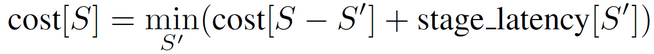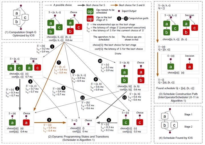 IOS采用动态规划的方法迭代的搜索最优尾段,直到未调度的顶点集为空。cost[S]表示顶点集S的最优调度的延迟,S’表示顶点集S的一个尾段,那么IOS的动态规划算法的状态转移如下公式表示, 即S的最优延迟是所有可能尾段S’的延迟和剩余顶点集S-S’的最优延迟之和的最小值。