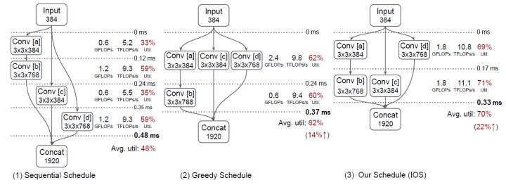 CNN近年来不断的在各种任务上刷新最好成绩,当然模型也变得更复杂,所需算力也在不断增加,如何实现CNN模型的高效推理成为在实际部署中的迫切需求。并行可以优化推理效率,Tensorflow和Pytorch均使用了算子内并行。但随着高性能硬件的快速迭代,仅仅算子内并行难以高效利用硬件资源。为了充分利用硬件算力,最近已有多项工作研究了多算子并行技术,这些并行方法通过启发式算法找到多个算子,并将这些算子并发执行。例如MetaFlow [2]。但是目前的启发式算法多关注于局部并行性的优化,得不到全局最优调度。例如图1所示的CNN,传统的顺序调度会分为四段,每段执行一个卷积算子;而基于贪心的调度会将卷积算子[a], [c], [d]并行起来,如图1-2,性能提升14%, 同时IOS得到的调度如图1-3所示,性能提升22%。示例中,贪心调度的方法不能得到最优效果有两个原因。首先,基于贪心的调度会将更多的算子放在早期执行段而较少的算子放在后续段,导致后续段的资源利用率低;其次太多的算子同时执行可能会导致资源竞争,从而导致性能下降。相比IOS调度,贪心调度的第一段存在资源竞争,第二段存在资源利用率低。