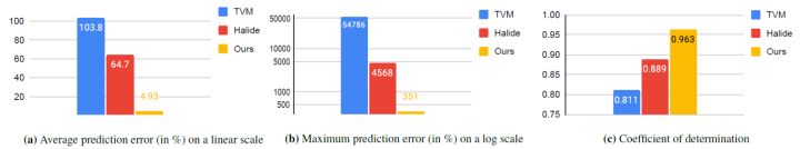 1.Cost Model。Cost Model的对比项主要是平均预测误差、最大预测误差、决定系数。由实验结果可以看出,论文的结果均远超于Halide、TVM。