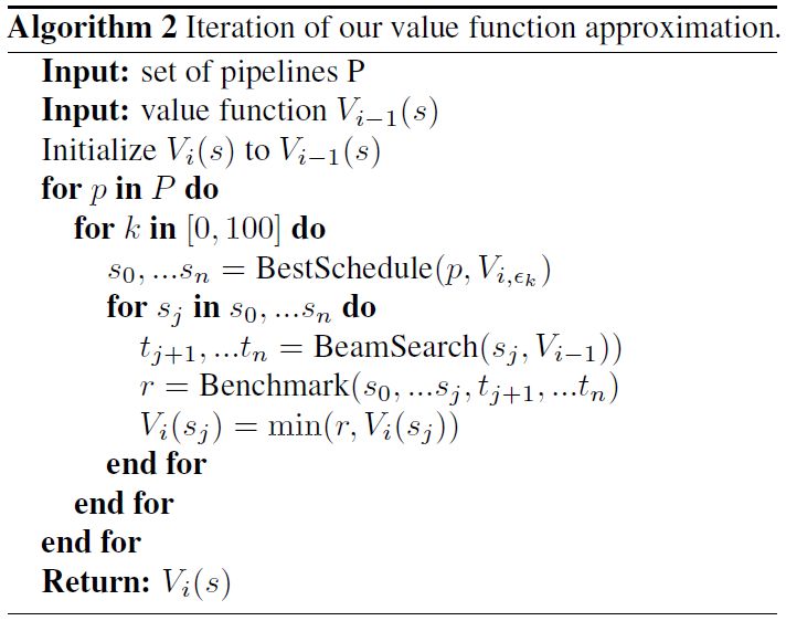 为了训练出更加精确的模型V(s),论文采用迭代式优化Value Function:(1)对于一系列的pipelines以及上一个Value Function Vi-1,通过Algorithm1获得对应的最佳调度序列s0…sn;(2)对于任意一个调度sj,通过BeamSearch的方式(即Beam形式的Algorithm1),获得后面的调度tj+1…tn,同时获得s0..sj,tj+1..tn调度序列的BenchMark结果r,更新Vi(sj)。