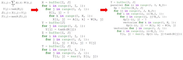 图2 由原始DSL到简单的schedule,再变换成高性能的schedule