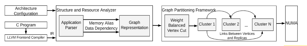 如上图所示,提出的方案大致分三个步骤:1) 构造 LLVM IR graph;2) 图切分;3) 切分后的clusters映射到多处理器上。