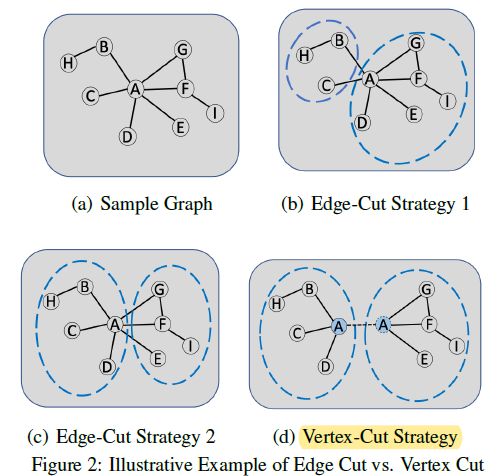 图切分。在构造好graph后,选择合适的图切分方式是核心问题。这时,有两种基本的图切分方式,边切分(Edge-Cut)和点切分(Vertex-Cut)。如下图所示,边切分中跨cluster的边会产生通信,而点切分中被切分的点在不同cluster中都有replica,通信来源于replica之间的同步信息。由于本工作的目标是最小化跨cluster的通信,且保持各个cluster之间的workload balanced,点切分相比于边切分是更好的方式。
