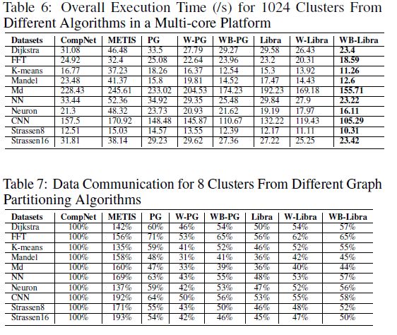 本工作使用gem5模拟器实验,模拟了NUMA架构的不同配置。应用用例包括:图计算,傅里叶变换,CNN,矩阵计算等。衡量指标包括执行时间,通信代价等。提出的四种算法都优于SOTA;在大多数场景中,Weighted-balanced Libra是表现最好的算法。下表是节选的两个实验结果。